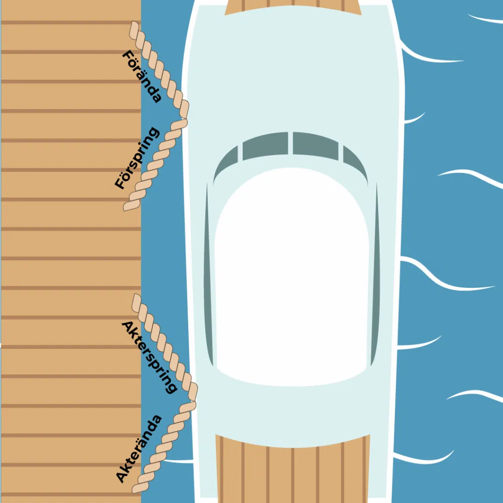 - Spring: Förspring och akterspring, extra förtöjningslinor som går snett över till bryggan från för och akter.