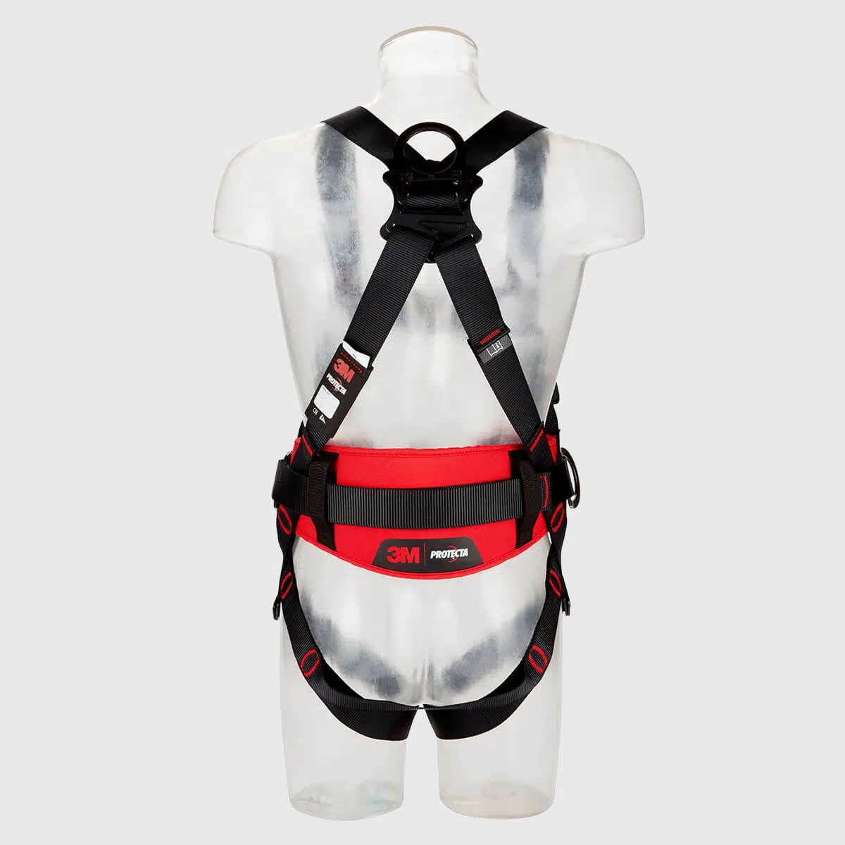 - 1 stor D-ring på ryggen för koppling till fallskydd.