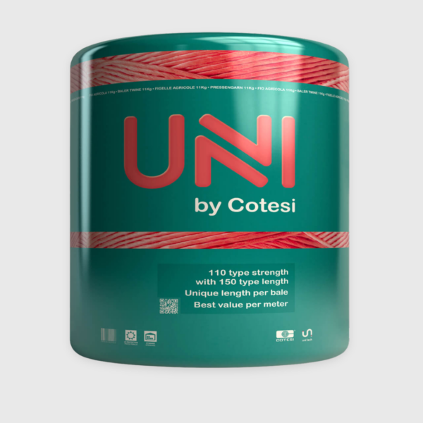 UNI pressgarn är nya generationens garn där man plockat modell 110:s knutstyrka och modell 150:s längd och skapat en helt unik produkt. Garnet passar alla pressar och har 47% mer längd i varje bal, vilket innebär färre spolbyten. Dessutom går UNI att använda för både halm- och ensilagepressning.