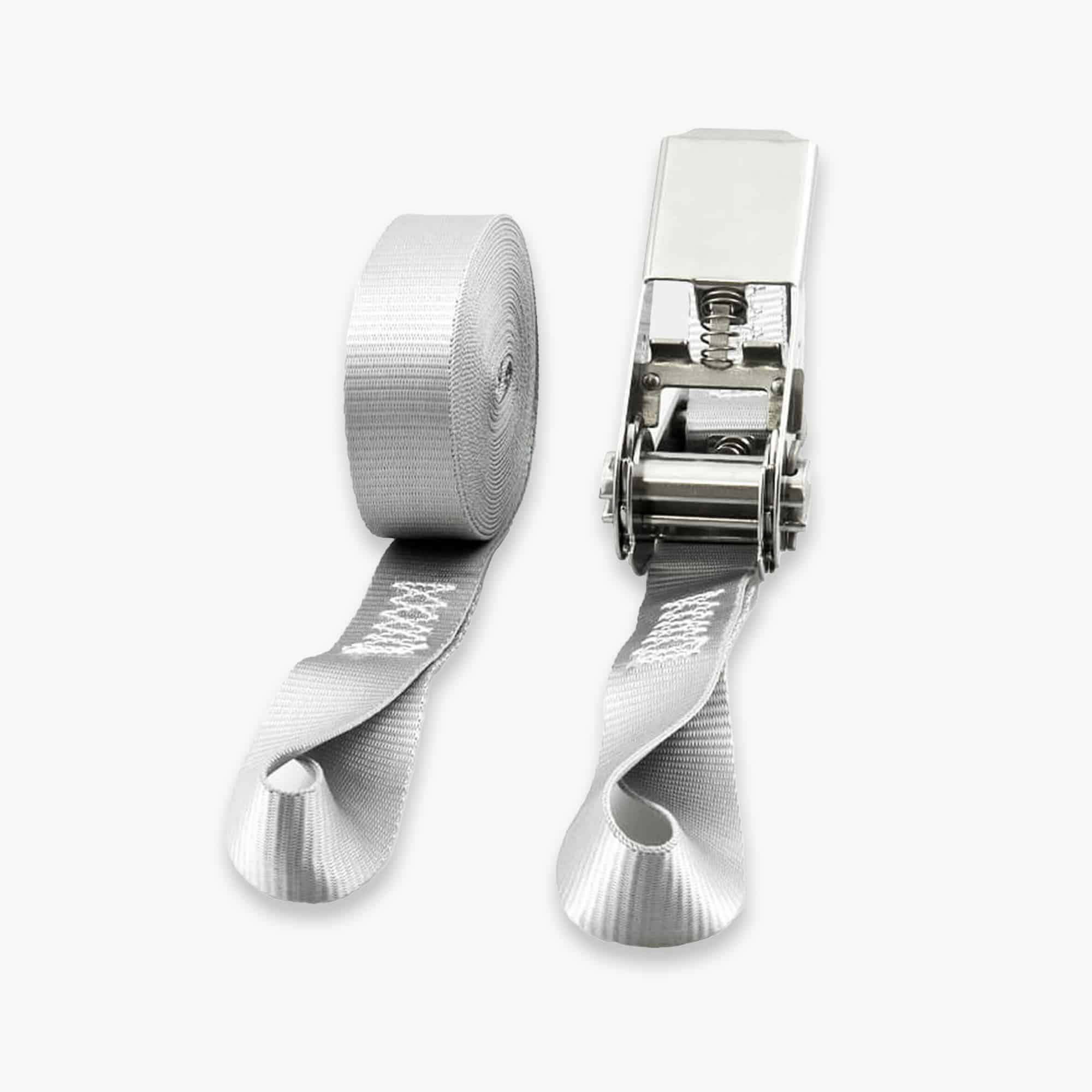 Detta är en tvådelad surrning som har en rostfri vinsch och två sydda ögon i ändarna som har flera fördelar. Tack vare de två sydda ögonen kan du fästa spännbandet både enkelt och säkert.