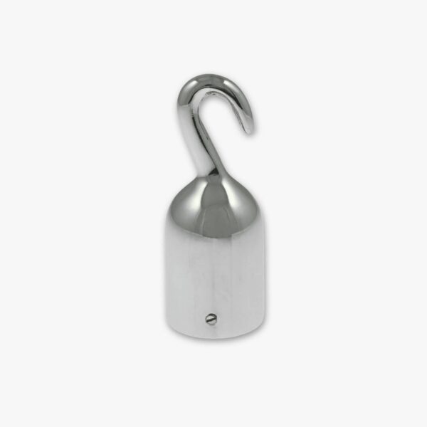 Ändbeslag med krok i blank krom. Beslag för användning som avslut på ditt rep där du vill kunna hänga upp din repände. Passar dimensioner på 36mm.