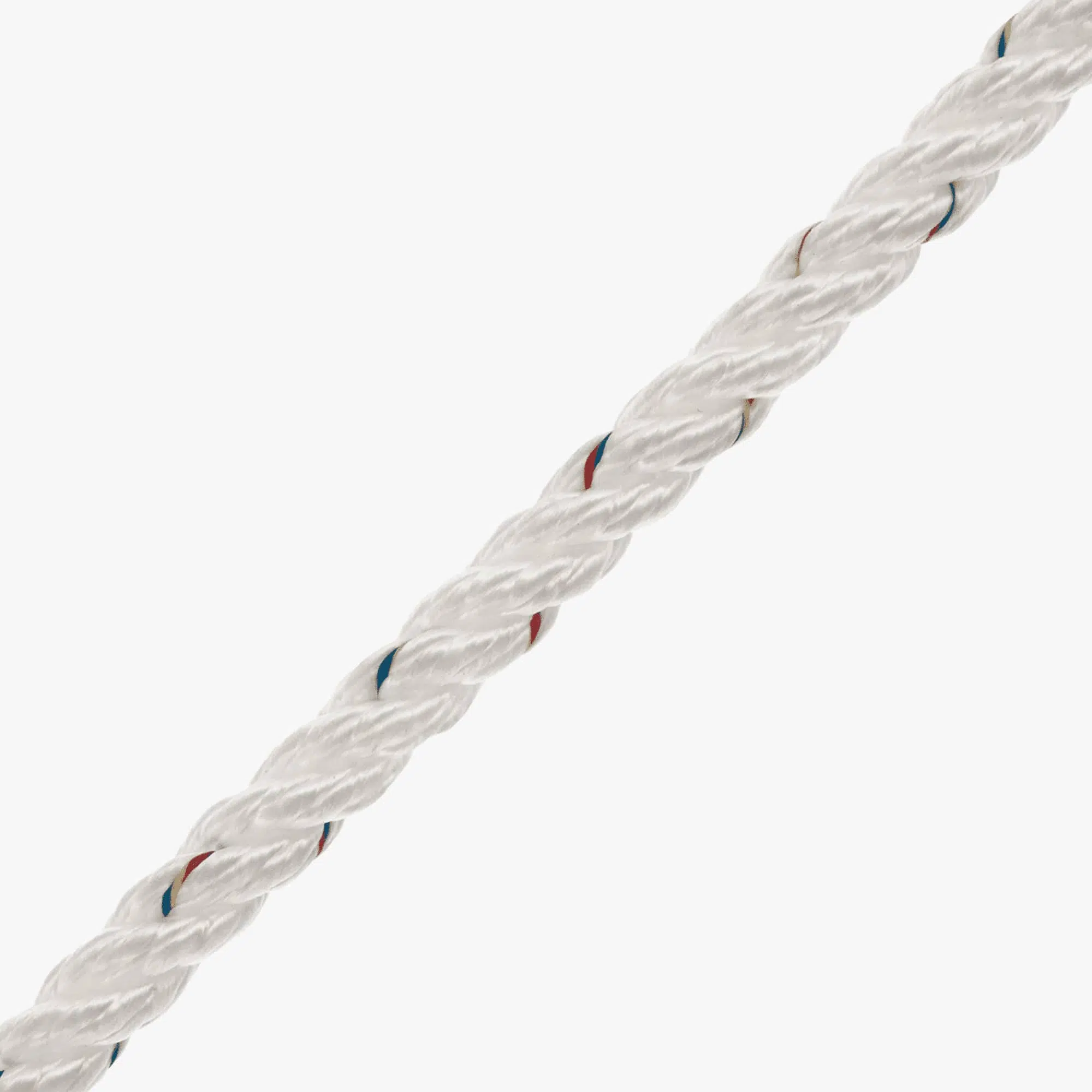 Försträckt och termofixerad polyester-lina med blå/gul/röd märktråd. Linan är 3-slagen vilket gör den lättsplitsad.